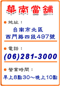 台南永康當鋪專業提供永康區當舖,免留車借款,汽機車借款,借錢.精品典當借款等服務,給您超低利,借款手續簡單方便,免求銀行,還錢沒負擔,快速放款。輕鬆渡過急需用錢的難關,無論您是初次使用當舖借款服務還是已經有過相關經驗,華南當鋪是您將有價物品變現金的好幫手。